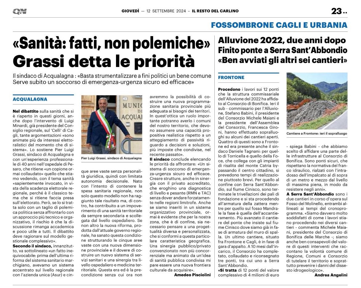 Articolo di giornale Grassi Pier Luigi Sindaco di Acqualagna detta le priorità sulla sanità